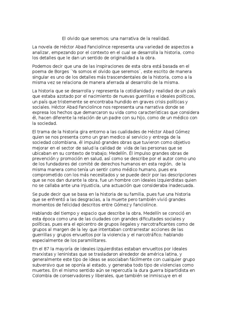 Este libro trata de la relación de padre e hijo, muestra que el padre de hector abad faciolince, fue un hombre generoso. El olvido que seremos es la reconstrucción amorosa, paciente y detallada de un personaje. Sinopsis de el olvido que seremos t.d.: El olvido que seremos es una novela testimonial del escritor colombiano héctor abad faciolince. Está lleno de sonrisas y canta el placer de vivir, pero muestra también la tristeza y la rabia que provoca ahora será también difícil olvidar este libro desgarrador de héctor abad faciolince escrito con valor y ternura.